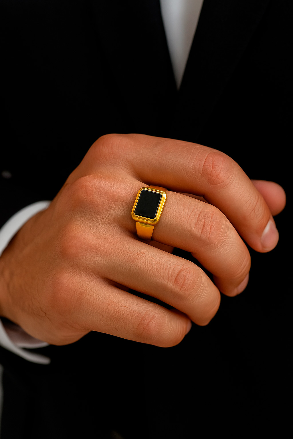 Este anillo enchapado en oro combina la elegancia clásica con una estética contemporánea gracias a su diseño tipo sello rectangular y piedra negra central. La forma geométrica y el acabado brillante del metal aportan un aire moderno y sofisticado, ideal tanto para looks formales como urbanos.