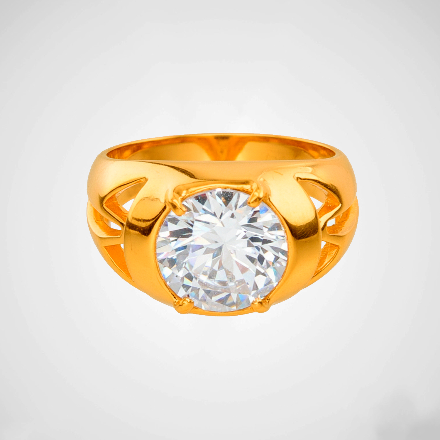Este imponente anillo enchapado en oro destaca por su diseño moderno de banda ancha y detalles calados, que aportan ligereza visual sin perder presencia. En el centro, una gran piedra cristalina de corte redondo captura la luz desde todos los ángulos, brindando un efecto deslumbrante que evoca el brillo de una estrella.