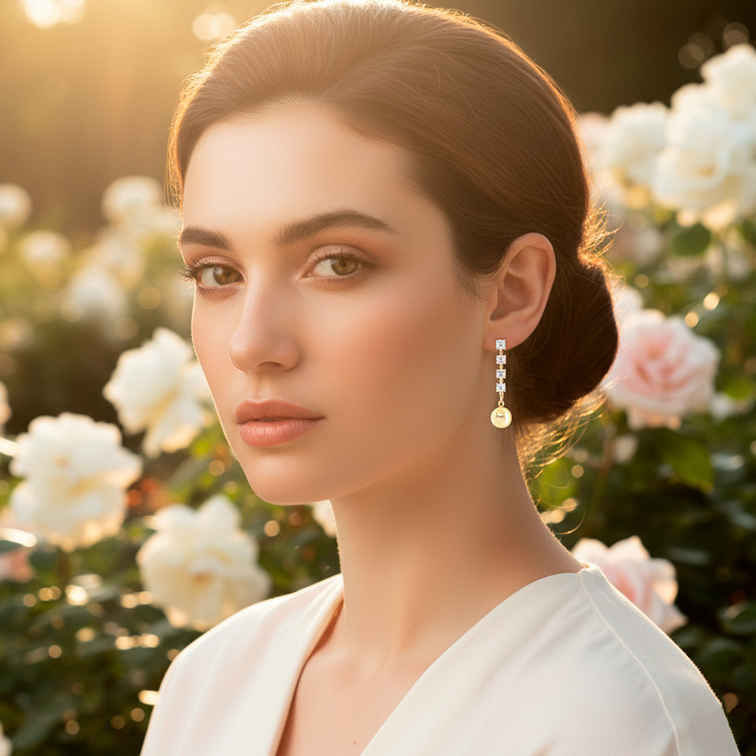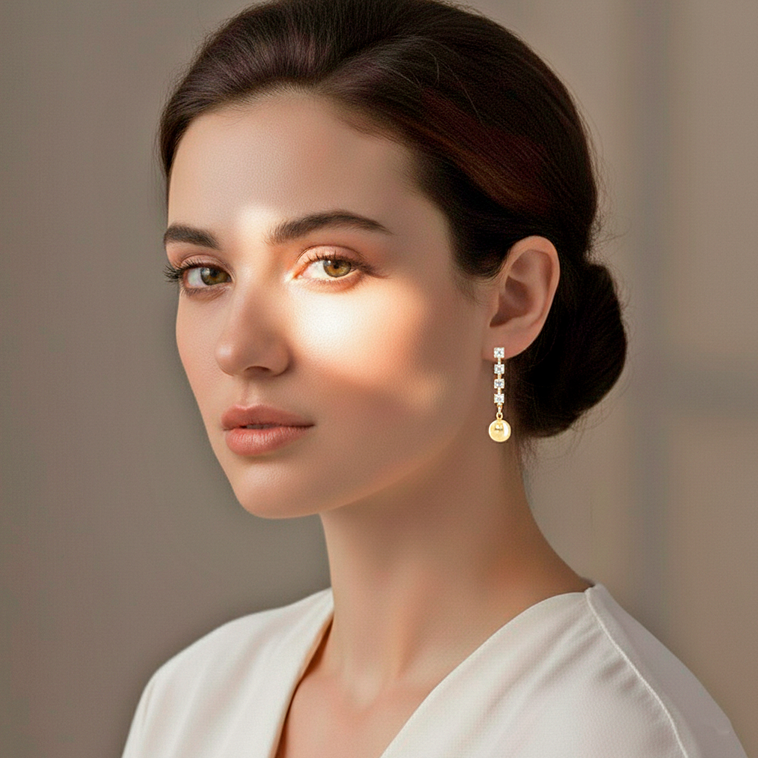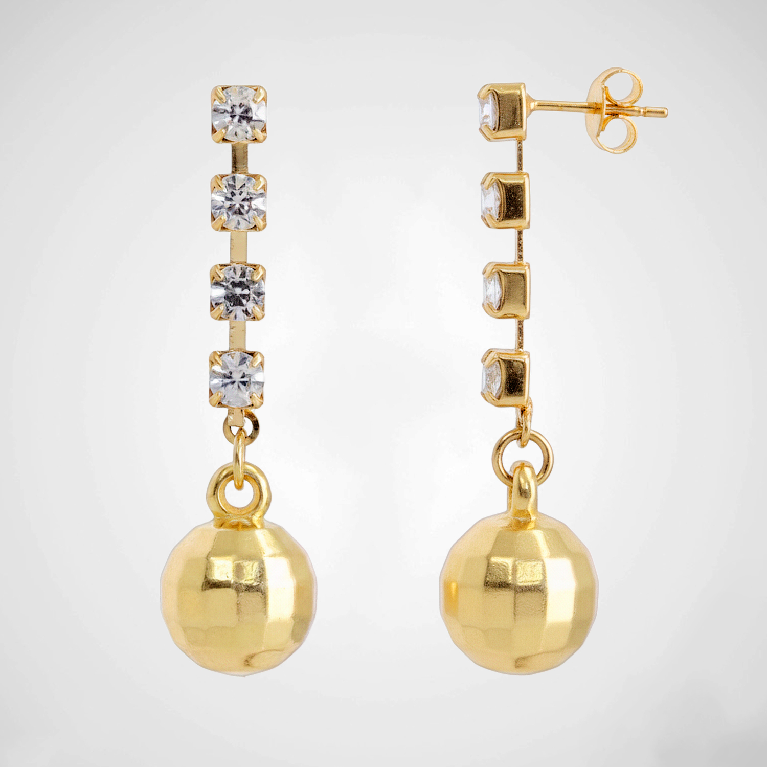 Aretes enchapados en oro de 18K con piedra granate central y cristales brillantes. Diseño colgante articulado de estilo imperial que combina elegancia, geometría y movimiento.