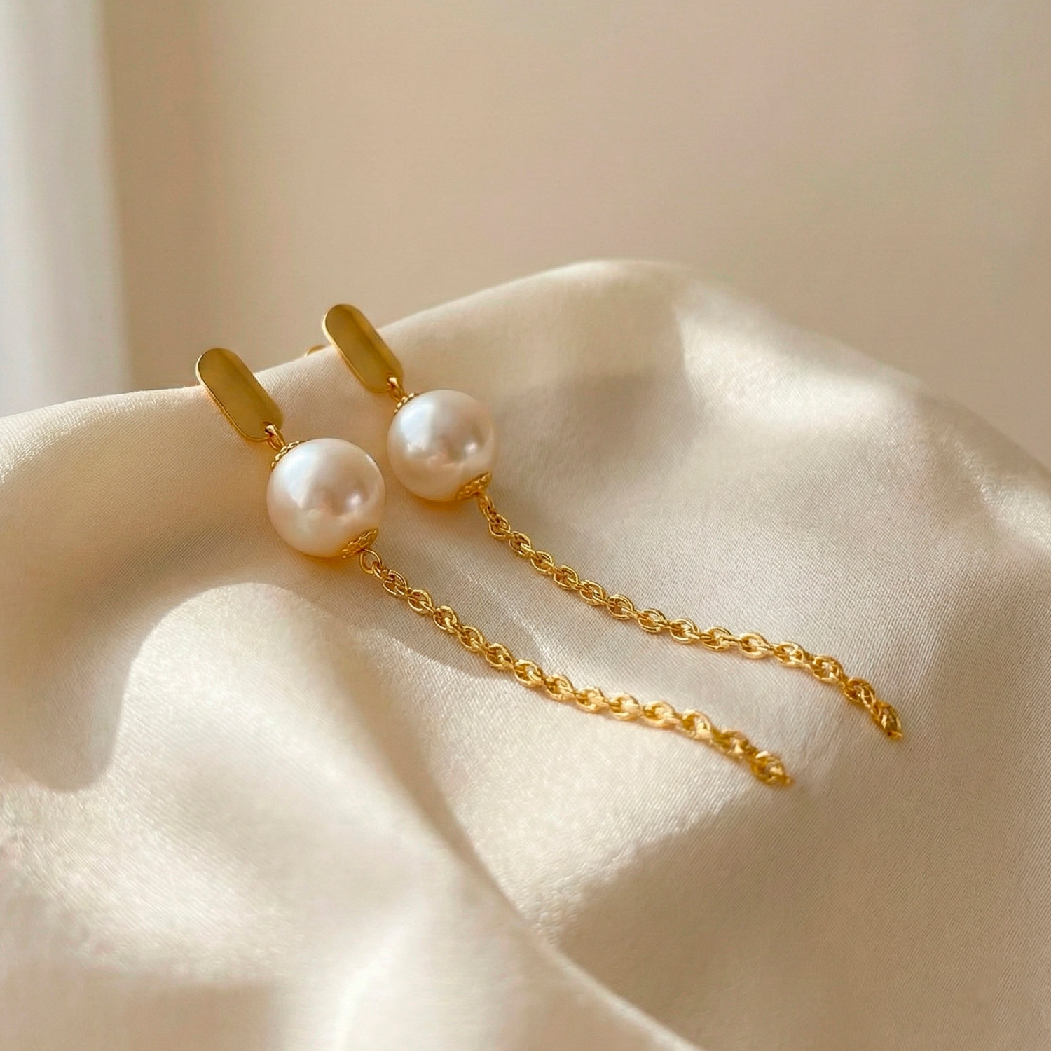 Aretes enchapados en oro de 18K con piedra granate central y cristales brillantes. Diseño colgante articulado de estilo imperial que combina elegancia, geometría y movimiento.