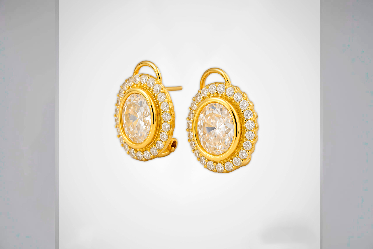 Aretes dorados estilo vintage con doble halo de cristales y centro facetado ovalado en corte brillante.